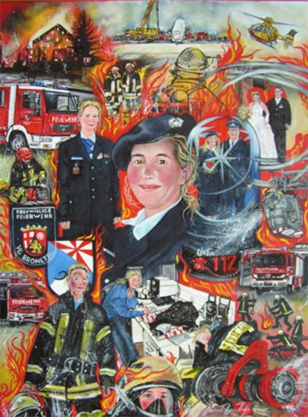 Selbstverständlich sind Feuerwehrautos und Einsatzmotive wie Hausbrand und Brückenunfall mit auf dem Bild, doch im Wesentlichen soll das Bild Linda Pfeifs Leidenschaft für alle Lebensbereiche zeigen.