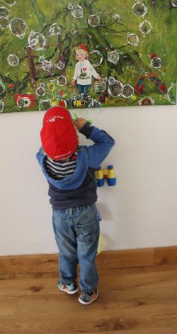(Moritz malt im Atelier in Fischbach immer mit, für die UtensilienBox am Bild interessierte er sich besonders, da Moritz sie selber beim Waldspaziergang befüllt hatte)